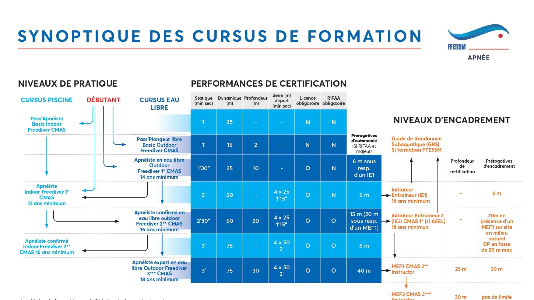 Dans le cadre des formations relatives à l’apnée, il faut distinguer les niveaux de pratique et les niveaux d’encadrement. Ceux-ci sont repris dans le tableau ci-dessous. Notre section apnée vous propose la possibilité de vous y inscrire, car elle dispose d’encadrants qualifiés permettant de suivre tous ces cursus.